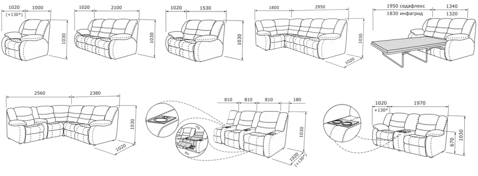 Кресельные модули оборудуются механизмами для отдыха «Реклайнер» с электрическим приводом. Комплектация модулей специальным подлокотником позволяет дополнить кресло-реклайнер функцией массажа. В отдельностоящих креслах возможна установка как электропривода, так и механизмов «Реклайнер» с ручным механическим приводом, которые в