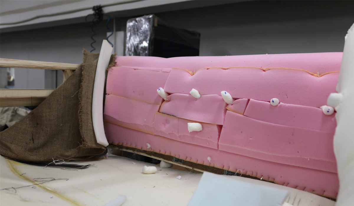 На фото нижче ми бачимо як виглядає зсередини спинка дивана.В ідеалі спинка повинна бути виконана з цільного листа поролону. На фото ми бачимо відходи виробництва — обрізки поролону.