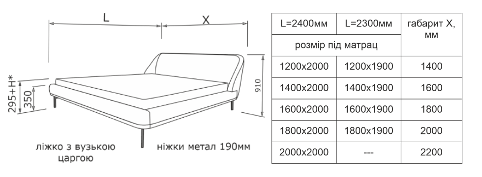 *ціна вказана за ліжко на ніжках зі спальним місцем 140 * 200 см, без ніші.