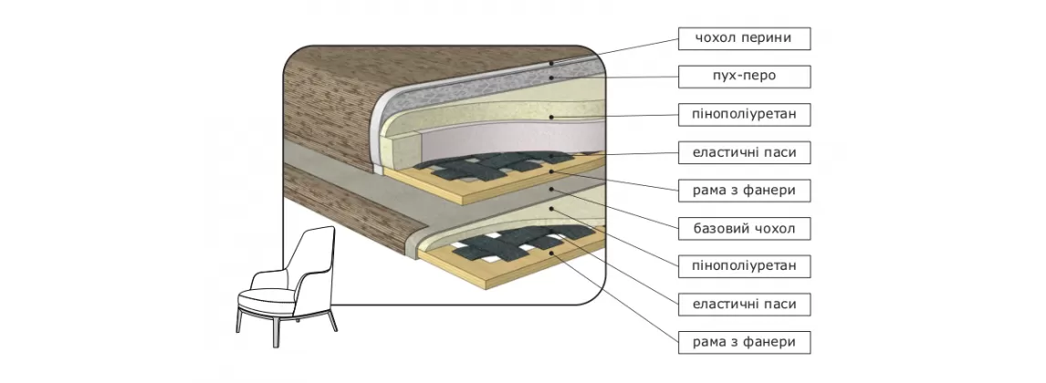 М'яка частина складається з комбінації пінополіуретану з периною з натуральної пухоперових суміші. Такий наповнювач неймовірно пружний, що дозволить зберегти меблів первісний вигляд надовго. Спинка і підлокітники наповнені листовим пінополіуретаном.