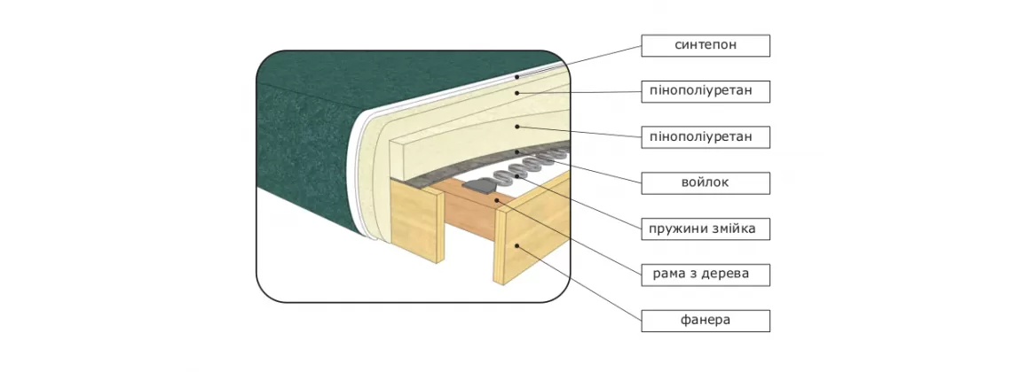 В основі каркасу використовується міцна і довговічна порода дерева - багатошарова березова фанера різної товщини (високого класу, що поставляється в Європу), сосновий брус і ясен.
