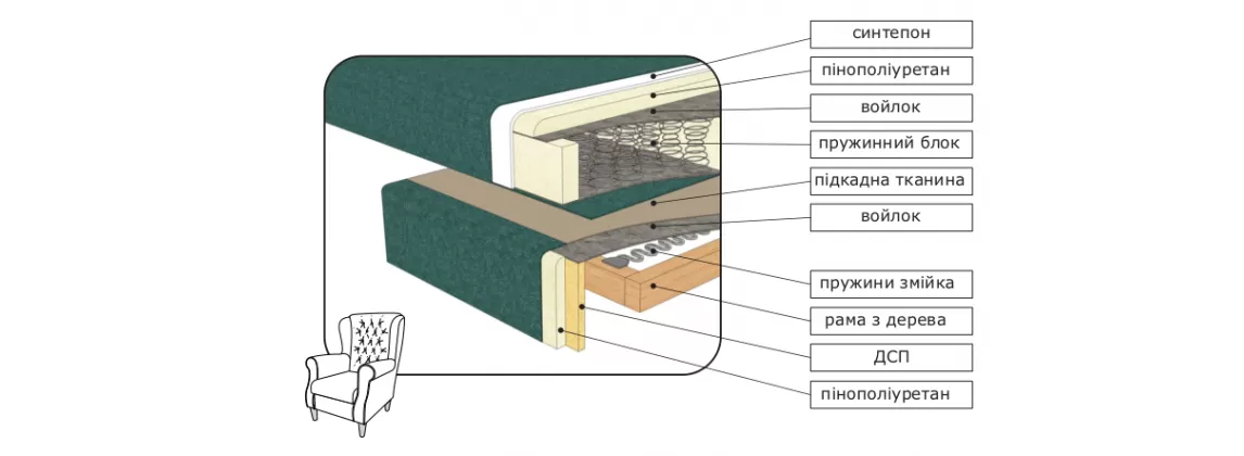 Каркас виготовлений з ДСП і дерев'яного бруса, а основою сидіння служать змієподібні пружини.